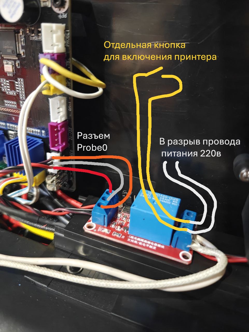 Логика работы следующая: когда срабатывает макрос POWER_MANAGEMENT в конечном G-code файла печати, в порт Probe0 (черный) материнской платы выводится логический «0», тем самым модуль реле отключается обесточивая принтер.