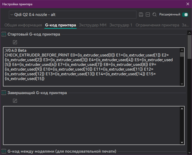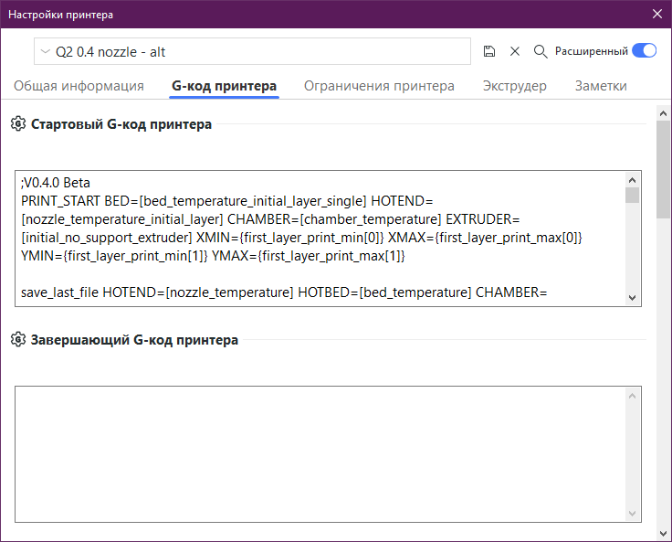 3.3.1.2 В «Завершающий g-код принтера» просто удаляем все, он должен быть пустой.