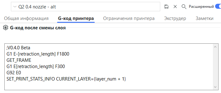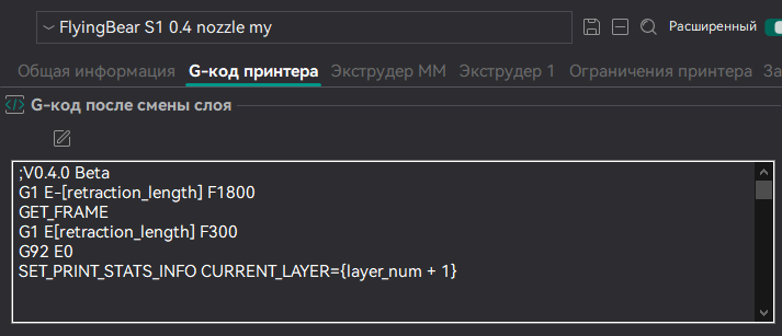 3.3.1.3 Далее, листаем до блока «G-код после смены слоя», удаляем все и вписываем следующее:
