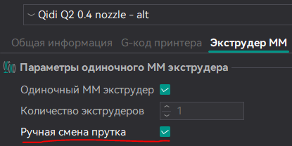 Есть несколько режимов поддержки смены филамента (работают только в Orcaslicer):