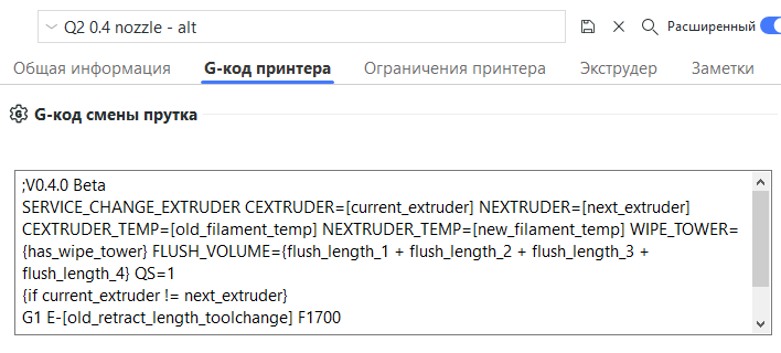 А также g-code смены прутка (Пункт 3.1.1.4/3.2.1.4 установки.) для обоих слайсеров.