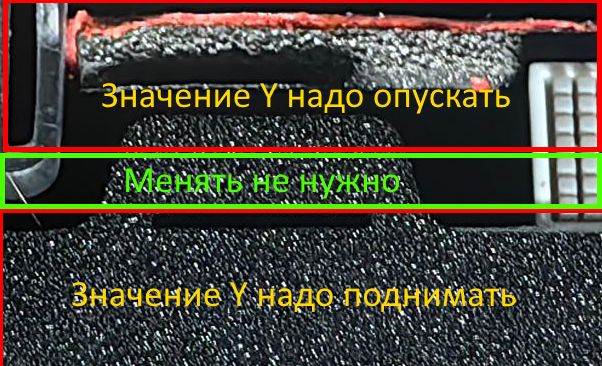 После чего смотрим где стоит кончик сопла. Если оно стоит в прорези между основой пластины и «ушком», то значение Y надо поднять пока кончик сопла не окажется на нижней половине «ушка».
