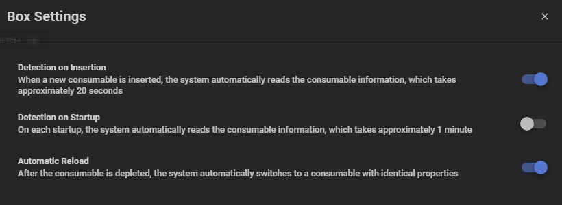 Detection on Startup при запуске принтера по новой перепроворачивает все заправленные катушки. Рекомендую выключить так как эта операция может занять по времени больше минуты.
