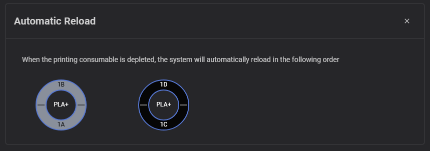 Для того чтобы автозамена работала, вы должны правильно настроить поставщика, материал и цвет каждого слота и для автозаменяемых катушек все три параметра должны быть одинаковые.