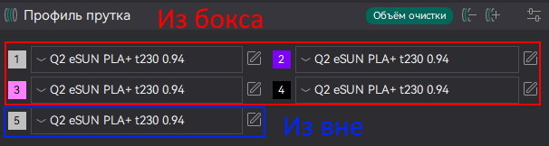 Для начала надо понимать, как принтер выбирает прутки. В отличии от студии в орке нет возможности сопоставить слоты пруткам в слайсере и поэтому в зависимости от того сколько у вас боксов у вас первые n-количество прутков будут считаться из боксов и их нумерация будет сопоставлена нумерации в боксах.