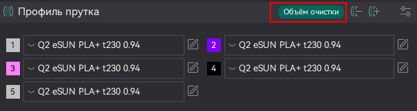 Если вы будете использовать черновую башню, то все эти объемы очистки будут идти в продувку сопла в нее и принтер при замене прутка не будет создавать отходы в мусорку.