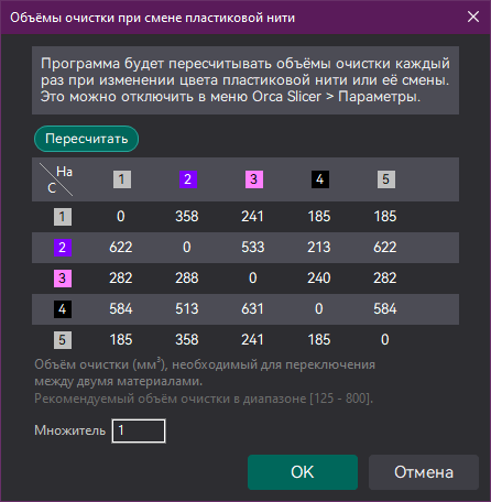 Однако авто расчет зачастую использует слишком высокие значения, в моих тестах для смены большинства цветов хватало 150, хотя слайсер предлагал в 2-4 раза больше. Какие значения будете использовать вы, смотрите сами. Для примера 150 кубов это где-то 60мм продувки прутка.